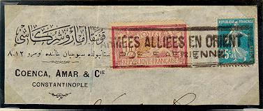 Ce cachet a été utilisé après l'Armistice de 1918 pour le courrier transporté par avion de l'Armée Alliée en Orient sur les lignes Constantinople-Bucarest et Constantinople-Salonique. Le trajet à partir de Bucarest ou Salonique s'effectuait ensuite par voie de ferrée (Orient-Express) ou par voie de mer.