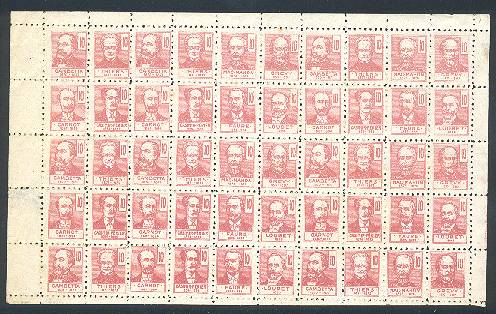 Il s'agit de timbres pour enfants, issus d'une boîte " La Poste enfantine " ou assimilée. ![]() Il n'ont aucune mission éducative ou officielle Les premiers jeux, vers 1900, auraient été vendus avec des timbres normaux oblitérés, puis dans les années suivantes, des mini-timbres sont apparus, copies de très nombreux types officiels ou de pure fantaisie. On connaît aussi : Atlas soutenant le globe terrestre (1, 5, 10, 15, 25 c.) Soleil se levant derrière une montagne (40 c.) Tour Eiffel (50 c. bleu) Arc de Triomphe (75 c. rouge) Timbre universel (20 c. bleu, origine incertaine) Série des Présidents de la République (8 valeurs en rouge ou gris) Timbres taxe divers... Types allégoriques divers... Il existait plusieurs valeurs au type Merson (50c et 1f) dans ces boîtes. L'impression est toujours très grossière, les timbres environ 3 à 4 fois plus petits que les " normaux ". Valeur : environ 20 F par vignette. D'autres vignettes de la poste enfantine : les présidents![]() il s'agit de la feuille de vignettes rouges à 10 (unité non indiquée ... au gré des enfants !!) Il existe la même feuille verte à 5, et quelques fragments orange à 15 et bleus à 25. Ces planches existent dentelées et non dentelées ; on ne sais par contre pas ce qu'il en est des Merson. Ces feuilles n'ont pas la même disposition de valeur à valeur ; y sont représentés, avec leurs dates de présidence :Gambetta 1870-1871, Thiers 1871-1873, Mc Mahon 1873-1879, Grévy 1879-1887, Carnot 1887-1894, Casimir-Périer 1894-1895, Faure 1895-1899,Loubet 1899. Il est légitime de penser que cette seule date de 1899 pour Loubet (qui sera président jusqu'en 1906) "date" l'édition de la feuille : clairement entre 1899 et 1906. (Renseignements amicalement fournis par MM. Richard GROSSE et Gilbert COLIN)